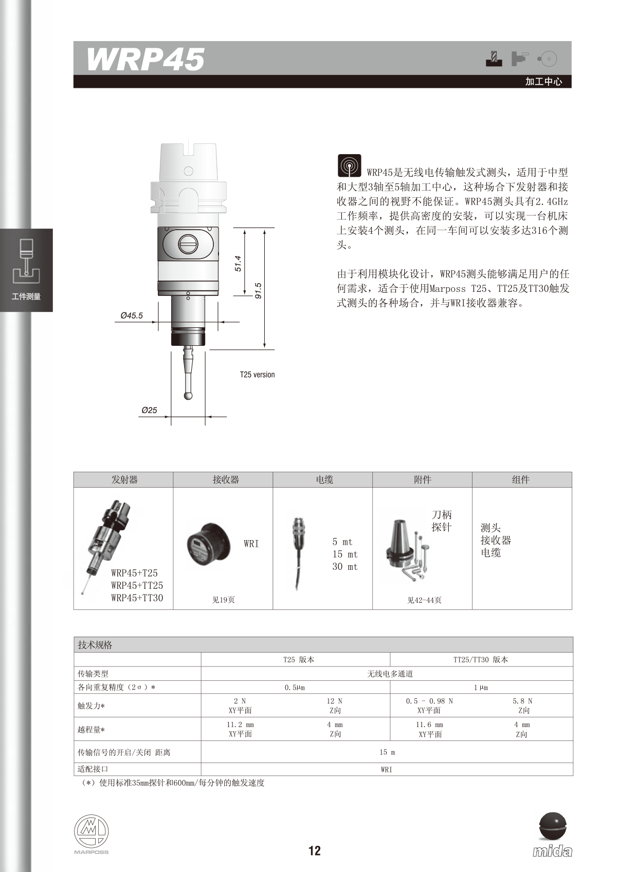 WRP45是无线电传输触发式测头,适用于中型和大型3轴至5轴加工中心,这种场合下发射器和接收器之间的视野不能保证。WRP45测头具有2.4GHz工作频率,提供高密度的安装,可以实现一台机床上安装4个测头,在同一车间可以安装多达316个测头